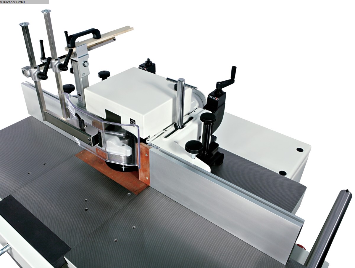 Robust craftsman's machine with 45° swivelling milling spindle on both sides and MK4 interchangeable spindle Sturdy grey cast steel construction Dynamically balanced milling unit anchored to the worktable Particularly robust design Smooth running thanks to precision units and high dead weight Right/left rotation and electronic blocking when changing direction as standard Five speeds from 3000 - 10000 min¯¹ The speed can be changed easily and conveniently from the machine side MK 4 interchangeable spindle system as standard Large grey cast iron worktable for lasting precisionLarge grey cast iron work table for lasting precision Easy handling thanks to operating elements and speed display on the front of the machine Large milling fence with fine adjustment and aluminium fence jaws as standard Fence adjustment via crank Numerical display of the set spindle height, accurate to a tenth Powerful industrial motors