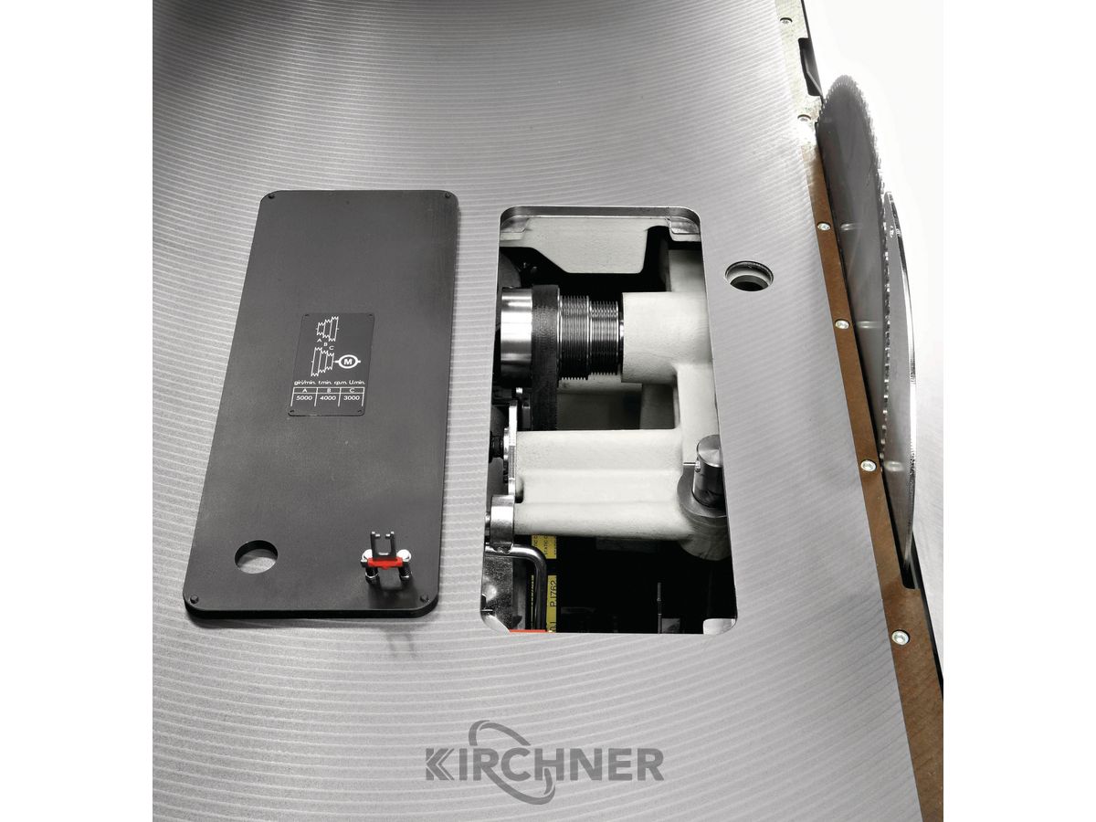 Drehzahl Hauptsägeblatt 3000/4000/5000 min¯¹ manuell durch Riemenwechsel bequem von oben